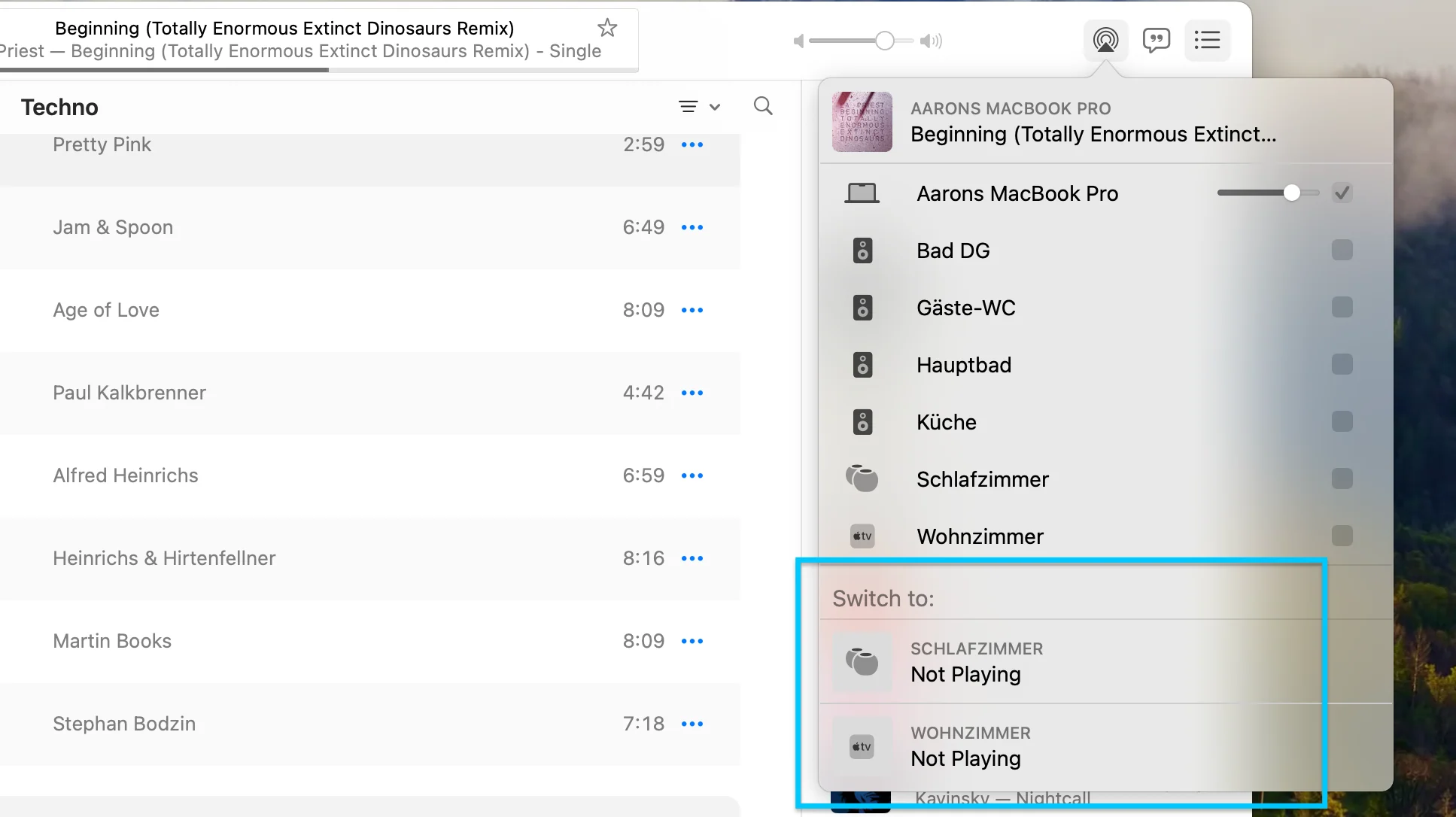 This can be done using the “Switch to” feature in Apple Music on the Mac, or the “Control Other Speakers & TVs” feature on iOS.
