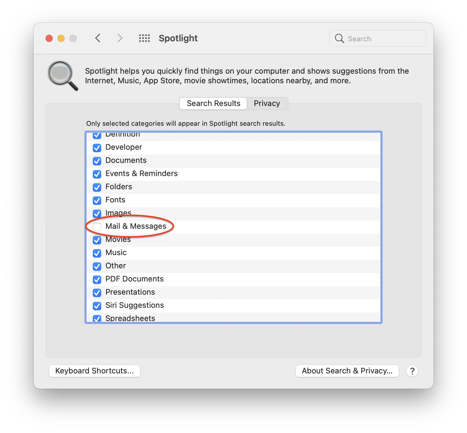 - Remove the checkbox from “Mail & Messages” (screenshot below)
