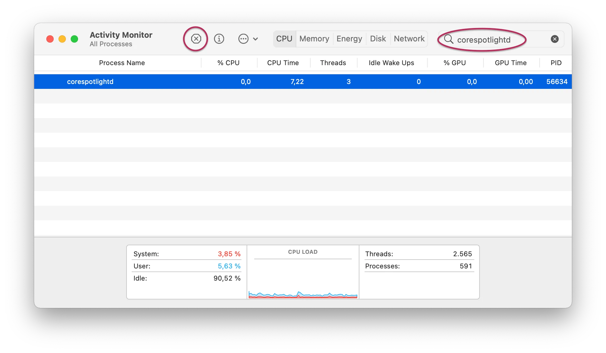So today, I’ve tried another workaround today that I’ve found on piunikaweb.com: Restarting the process “corespotlightd”. This has solved the issue for me, but I’m sure it’s—again—just temporary, as I don’t see how this would solve the underlying problem. Still, it is the quickest workaround the I’ve found so far.