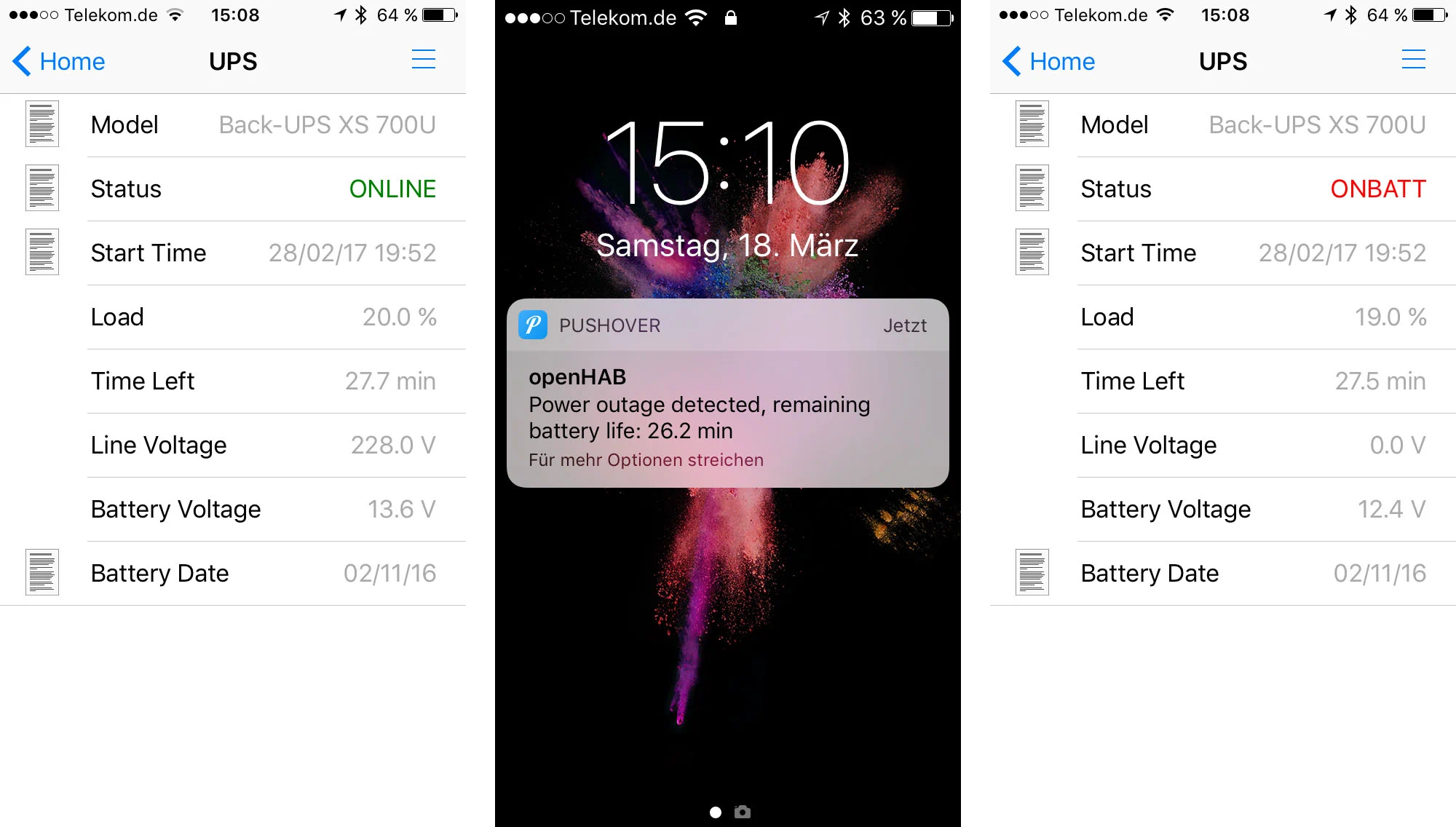 To get a notification on your mobile device whenever the power fails (and also when it returns), configure the pushover binding and add the following rule to your apc.rules: