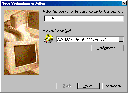 Öffnen Sie den Ordner “DFÜ-Netzwerk” im Arbeitsplatz und doppelklicken Sie auf “Neue Verbindung erstellen”. Geben Sie der Verbindung einen Namen, wie z.B. “T-Online” und wählen Sie Feld darunter das Gerät, was zur Einwahl verwendet werden soll.
