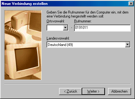 Klicken Sie nun auf “Weiter >”. Geben Sie auf der nächsten Seite in das Feld “Rufnummer:” die bei Ihnen zutreffende Einwahlnummer von T-Online ein (siehe oben). Das Feld “Ortsvorwahl” wird leer gelassen.