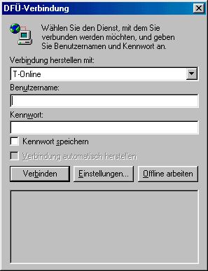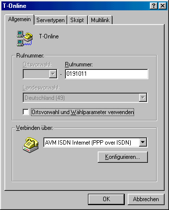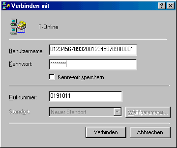 Art der Verbindung Einwahl Modem mit normalem Telefonanschluss 0191011Modem mit einer Telefonanlage 0,,,0191011ISDN mit normalem Telefonanschluss 0191011ISDN mit Telefonanlage 00191011T-DSL 0(Keine Einwahl erforderlich)Benutzername (T-Online-Anschlusskennung + T-Online-Nummer + # + Mitbenutzernummer + @t-online.de)