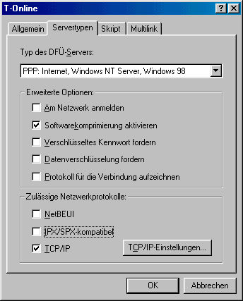Rufen Sie jetzt die Registrierkarte “Servertypen” auf und entfernen Sie die Häkchen bei “Am Netzwerk anmelden”, “NetBEUI” und “IPX/SPX-kompatibel”.