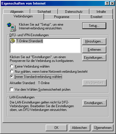 Es ist empfehlenswert, den Internet Explorer so einzustellen, dass er eine Verbindung zum Internet herstellt, sobald diese benötigt wird. Klicken Sie dazu mit der rechten Maustaste auf das Internet Explorer-Symbol auf dem Desktop und wählen Sie “Eigenschaften”. Klicken Sie jetzt auf “Verbindungen” und machen Sie ggf. die Verbindung zu T-Online zur Standardverbindung. Wählen Sie jetzt die Option “Immer Standardverbindung wählen” und klicken Sie auf “OK”. Diese Einstellung ist auch bei der Verwendung eines anderen Browsers sinnvoll.