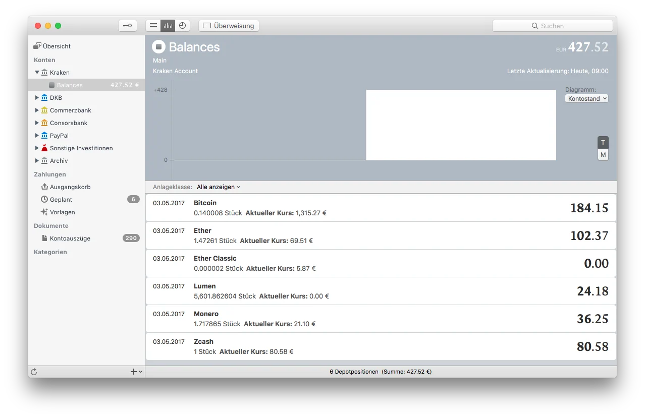 MoneyMoney is a neat banking software for the Mac, mostly targeted to the German market where most banks support the FinTS/HBCI protocol. In addition though, MoneyMoney supports many banks (and similar services such as PayPal) via HTTP-based APIs or—as a last resort—good ol’ web scraping. That’s really great, as it allows you to track virtually all your balances in a single place.